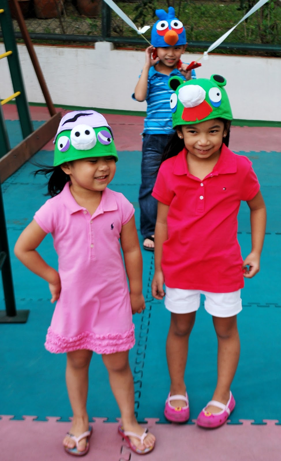 | I let the kids wear Angry Bird and Pig hats. These little girls look so adorable! =) |
